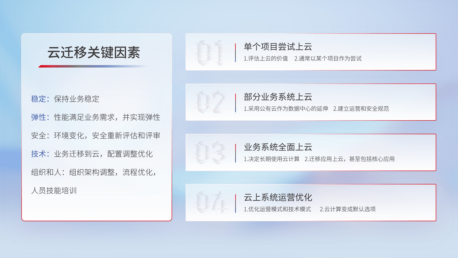 结合实际业务,,,从规划设计、、、云平台选型、、、、云原生改造、、数据迁移、、、、集成交付,,,迁移全过程为客户识别最佳上云路径,,,,做好风险识别管理,,,,设计网络架构、、身份权限、、、安全审计合规、、、操作审计、、、日志审计、、、监控告警策略、、、、多站点容灾设计等,,,,对云上基础设施进行整体规划,,,,提升IT治理水平,,以满足弹性、、、高可用、、高性能的需求。。。