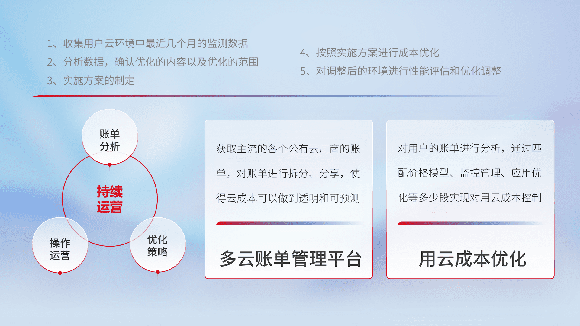 通过多云纳管,,以统一的资源数据模型把客户的云资源进行抽象和封装,,进而实现对多云资源的统一操作,,保障云资源管理的可靠性、、、稳定性与可用性。。。。量身定制化运维内容,,配置、、、、开发运维、、补丁管理、、、、备份、、、监控、、认证和访问管理、、、、审计和日常巡检等,,,,保障在用云过程中的可靠度,,稳定度以及高可用率。。。。