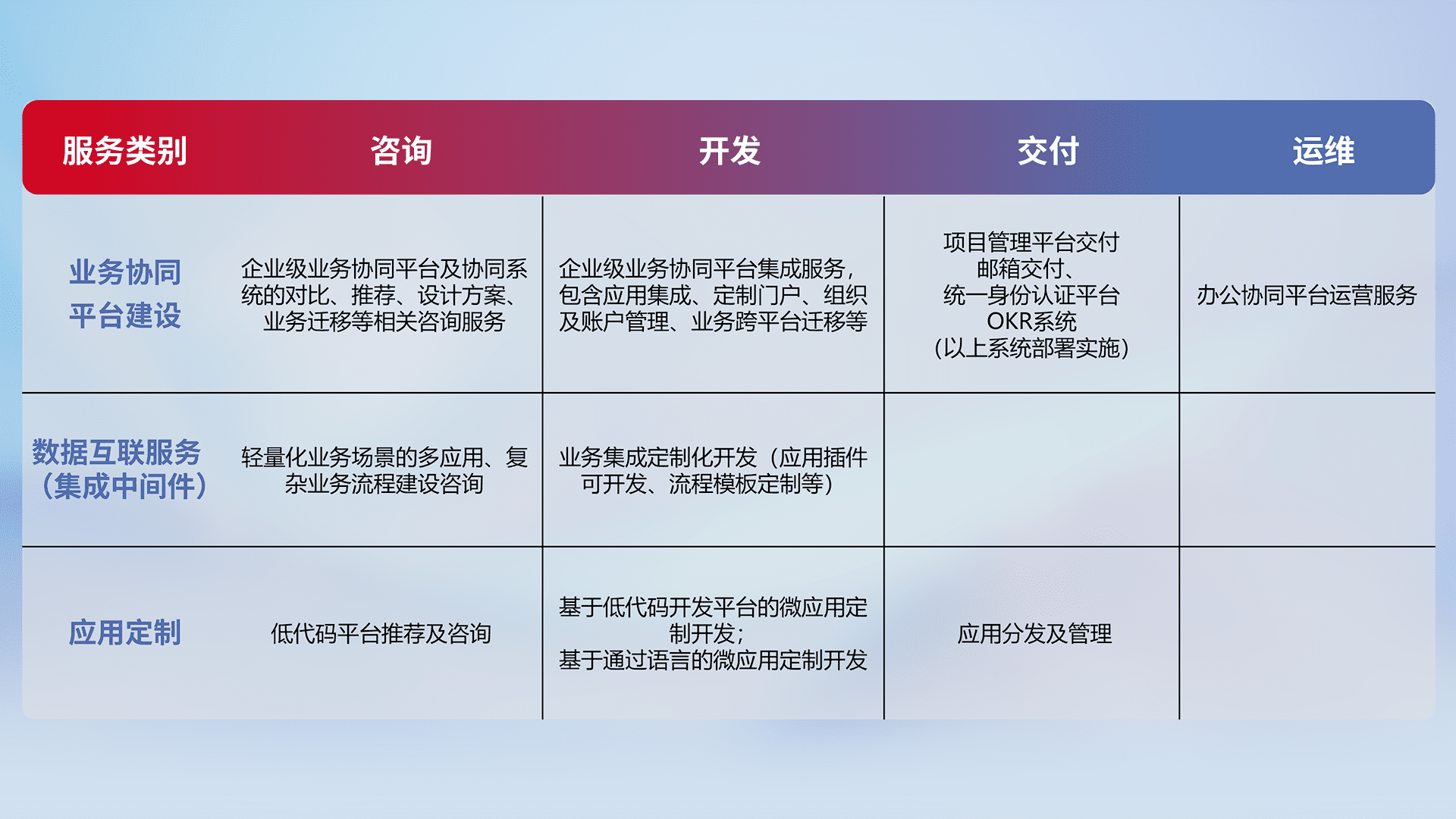 针对钉钉、、企微、、IDaas等平台级产品提供产品的规划、、、、方案、、、交付、、、、定制化开发等服务,,实现如统一协同办公、、智能客户服务、、、混合会议管理、、、、智能数据查询、、等业务场景,,实现数字化转型。。。。